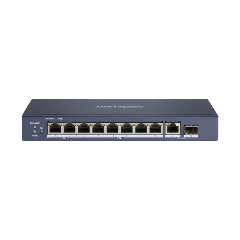 Ports 6 ports PoE Gigabit, 2 ports Hi-PoE Gigabit, 1 port RJ45 Gigabit et 1 port fibre optique Gigabit